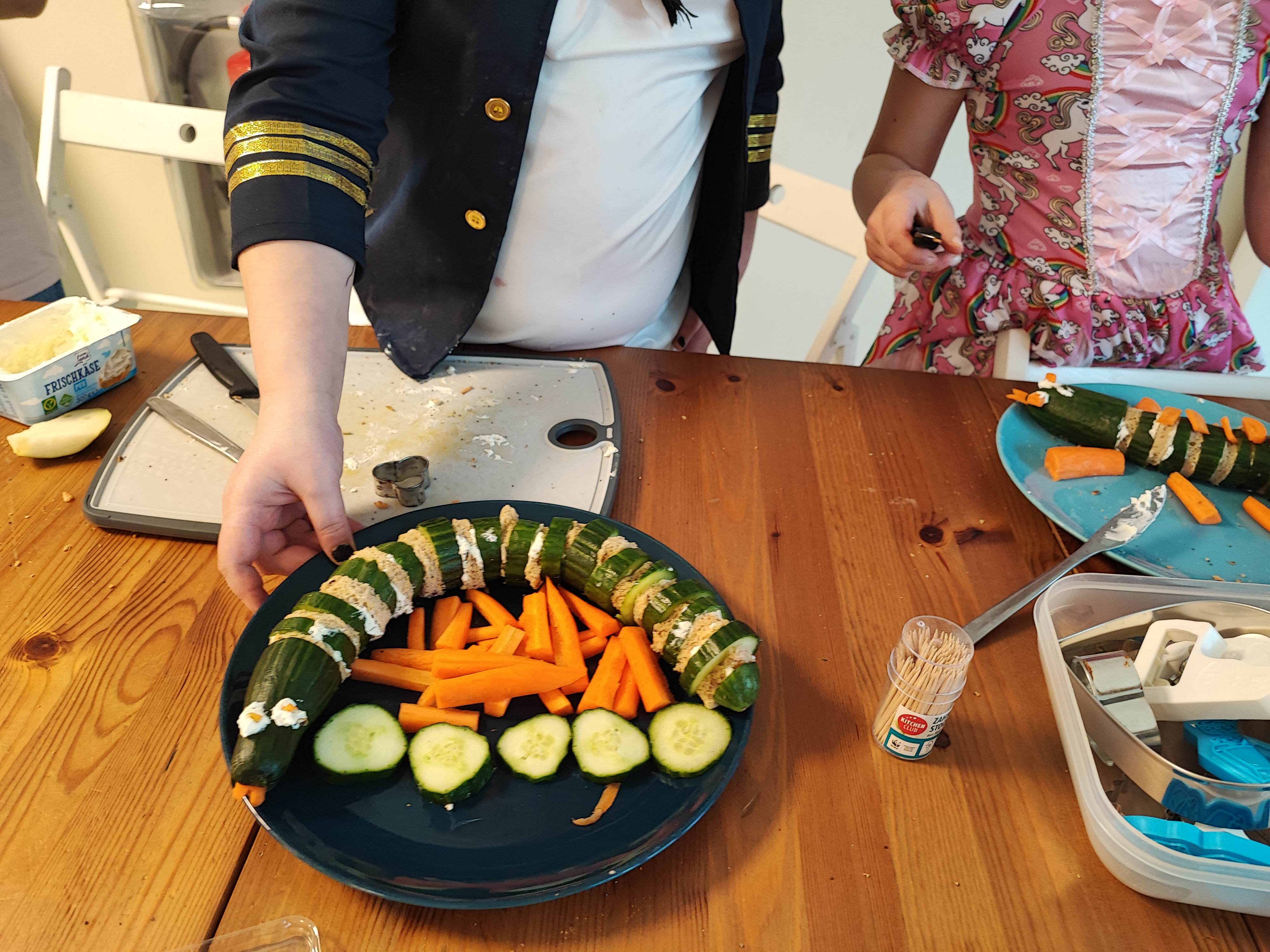 Ein besonderes Highlight waren die gesunden Snacks, die die Kinder selbst zubereiteten. Mit viel Kreativität und Ausdauer entstanden fantasievolle Leckereien: Igel aus Birnen und Trauben sowie Gurken-Frischkäsebrot-Schlangen sorgten nicht nur für Begeisterung am Buffet, sondern auch für staunende Blicke bei den Eltern. Viele zückten ihre Handys, um Fotos der kleinen Kunstwerke zu machen – mit dem festen Vorsatz, die Ideen zuhause nachzumachen.